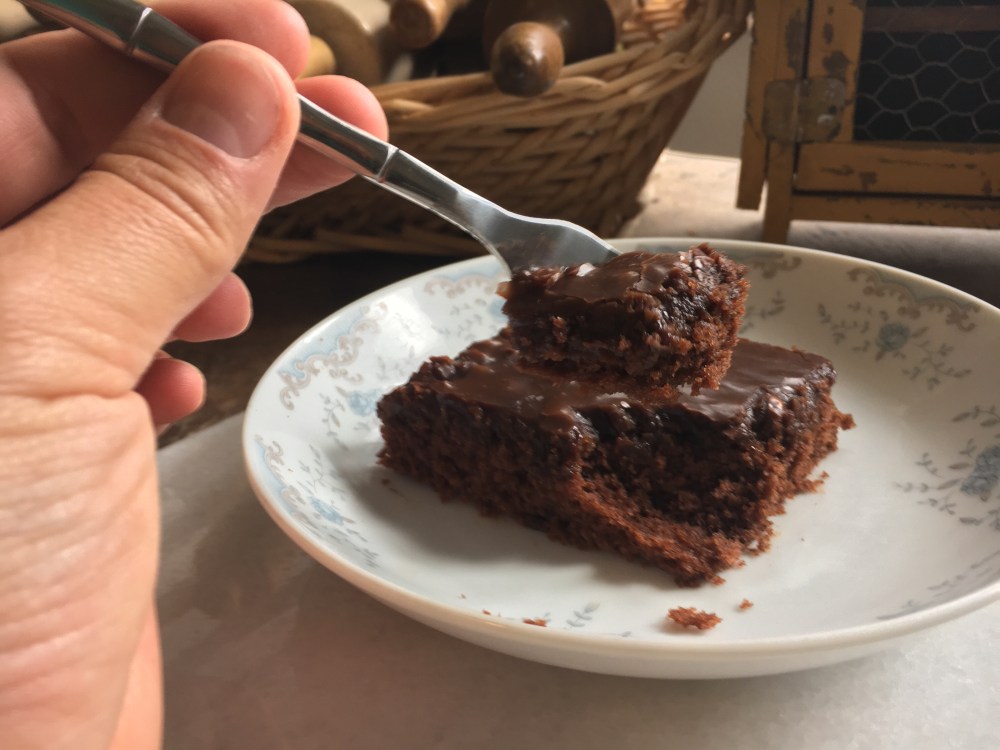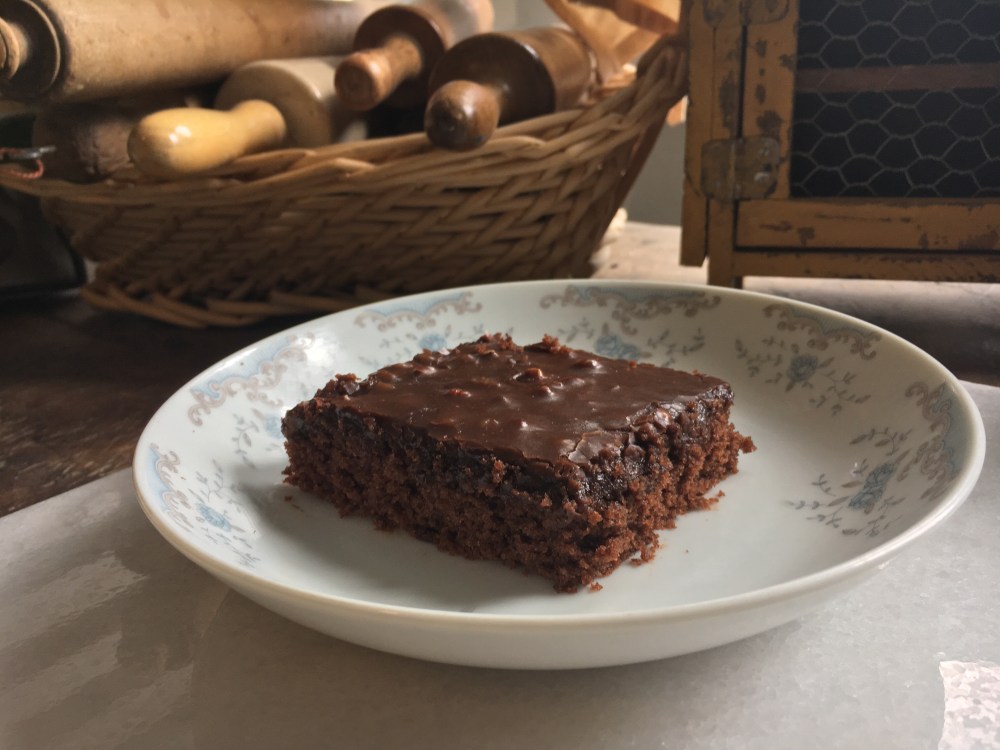 This moist cocoa based nutty dessert was baked in a large 12×18 inch jelly roll pan. I loved this dessert because it is so easy and is delicious for days and serves a crowd. (Or just a household of two π