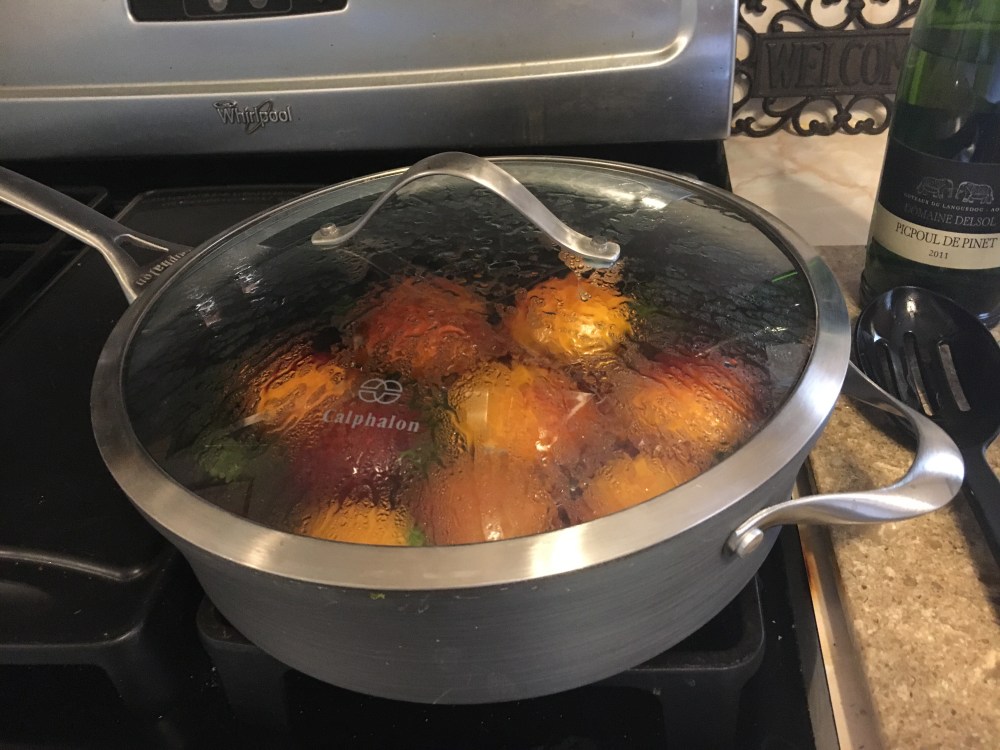 I love fresh peaches and I’ve always wanted to try poaching them. I looked at different poaching recipes and decided on this for two reasons. First, I simply had the ingredients at hand and secondly, I wanted to find a recipe that complemented the sweet and savory of the lavender and basil.