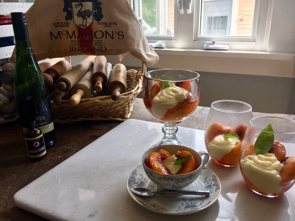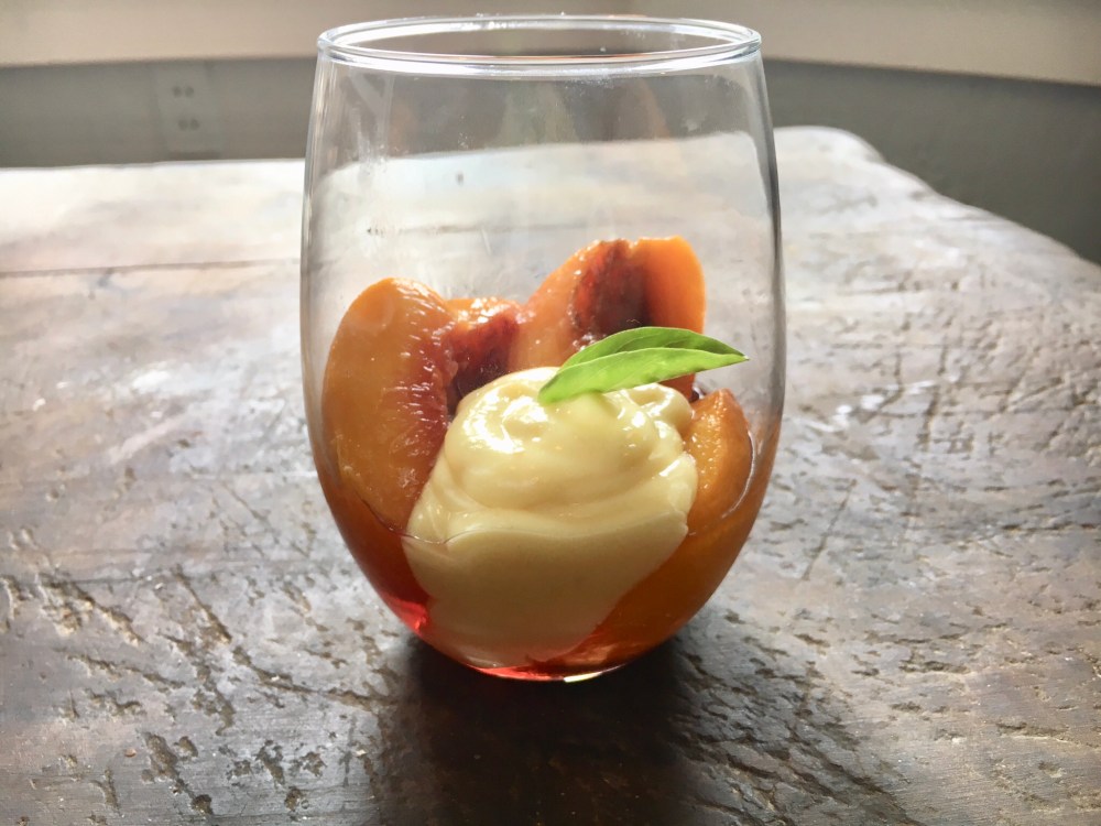To celebrate a good friend and coworker’s birthday I decided to share my newest experiment. So, today, my next peach inspired recipe is Basil and white wine poached fresh peaches with a lavender creme patissiere. These sweet and tangy peaches are covered in a sweet basil infused syrup, plated, and then topped with a dollop of lavender spiked cream.